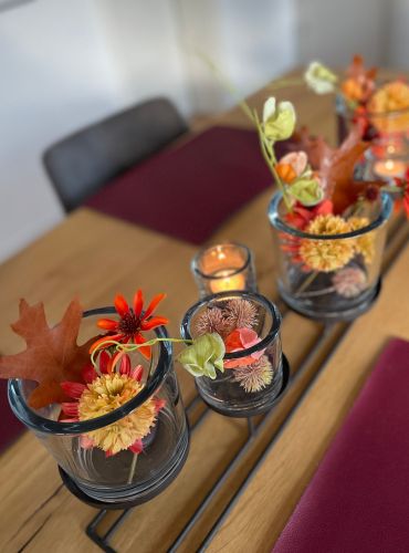Ob Zierkürbisse, Blätter, Beeren oder getrocknete Blumen – kombiniert mit natürlichen Materialien entstehen warme, gemütliche Arrangements, die das Zuhause in herbstliches Licht tauchen.